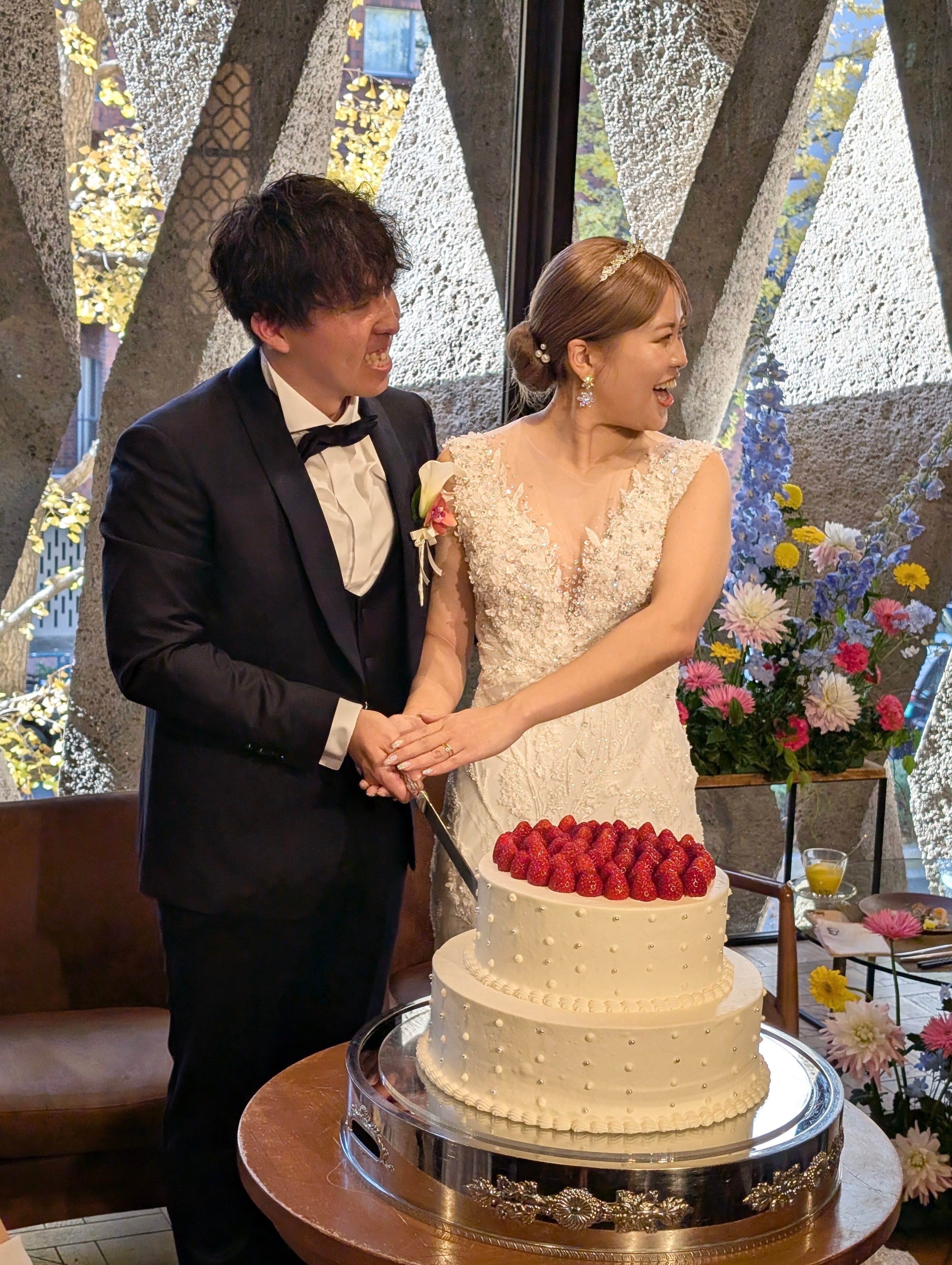光を受ける角度ごとに煌めきを放ち、披露宴会場のライトや自然光の下で歩くたびに輝きます。
